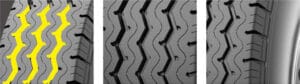 Three wide grooves provide excellent water evacuation; the longitudinal and transverse tread design enhances handling and resists side-slip; reinforced shoulders reduce uneven wear for long-distance durability.